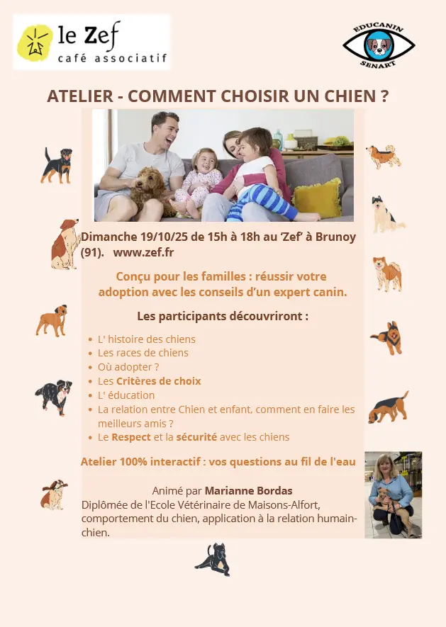 L'animatrice de l'atelier, Marianne Bordas, est diplômée de l'Ecole Vétérinaire de Maisons-Alfort, comportement du chien, application à la relation humain-chien.